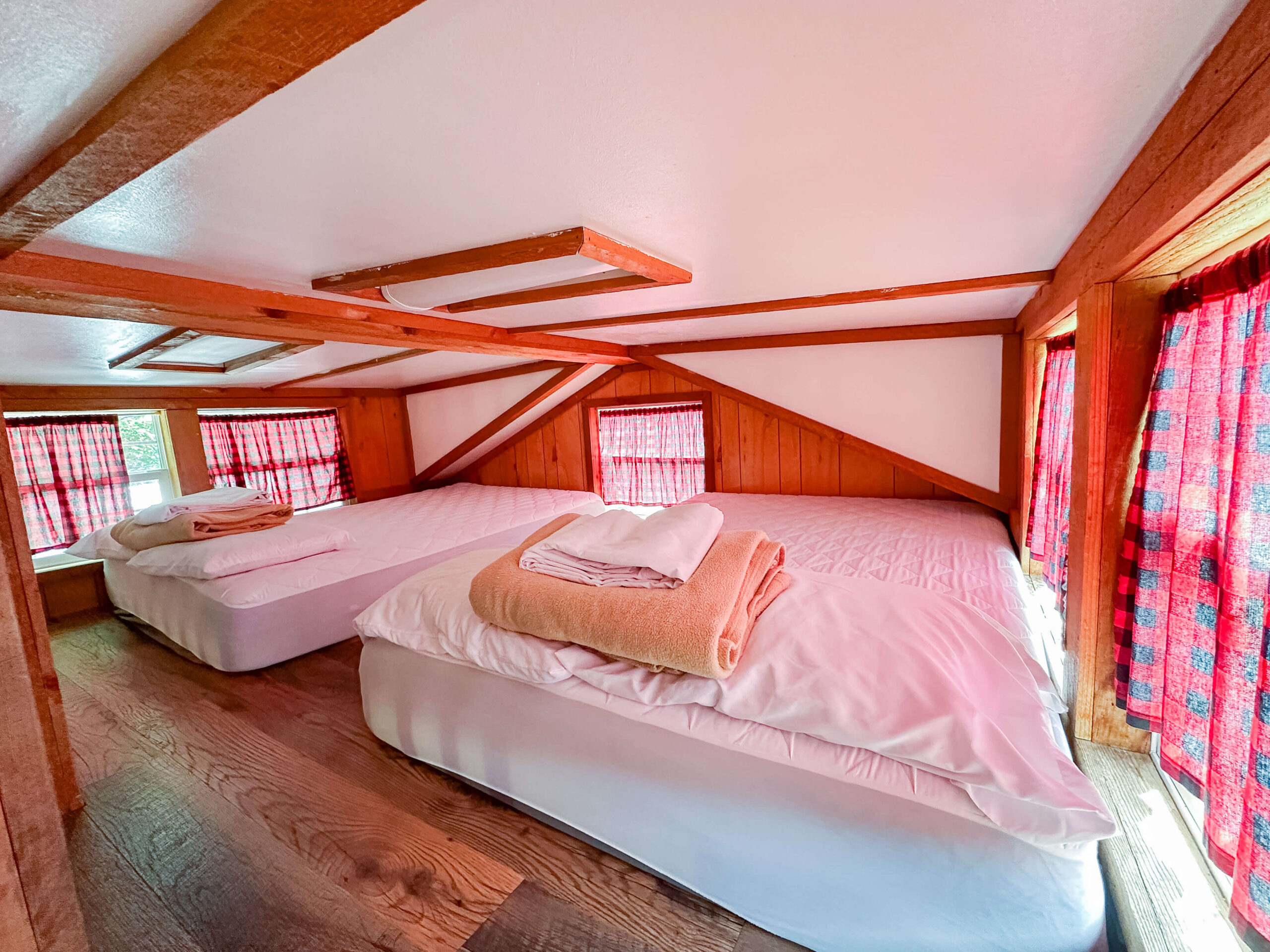 Sleeping accommodations include 1 Queen Bedroom, 2 Full-size mattresses in the loft and one sleeper sofa (Pull out sleeper sofa will accommodate two children or 1 adult comfortably) Maximum four adults.