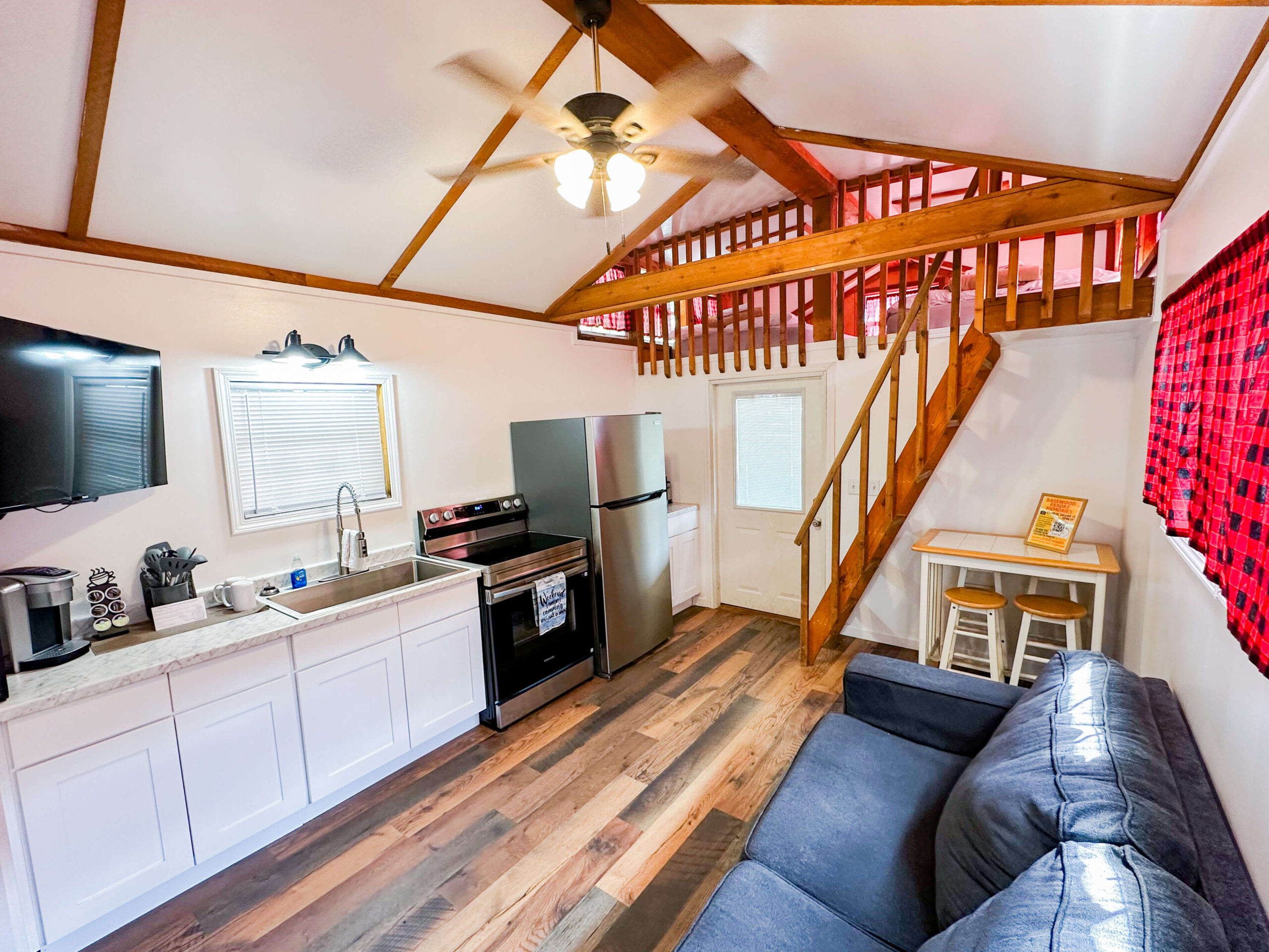 The kitchen includes mini-fridge, microwave, cook top, single bowl sink, coffee pot, cooking utensils & dinnerware